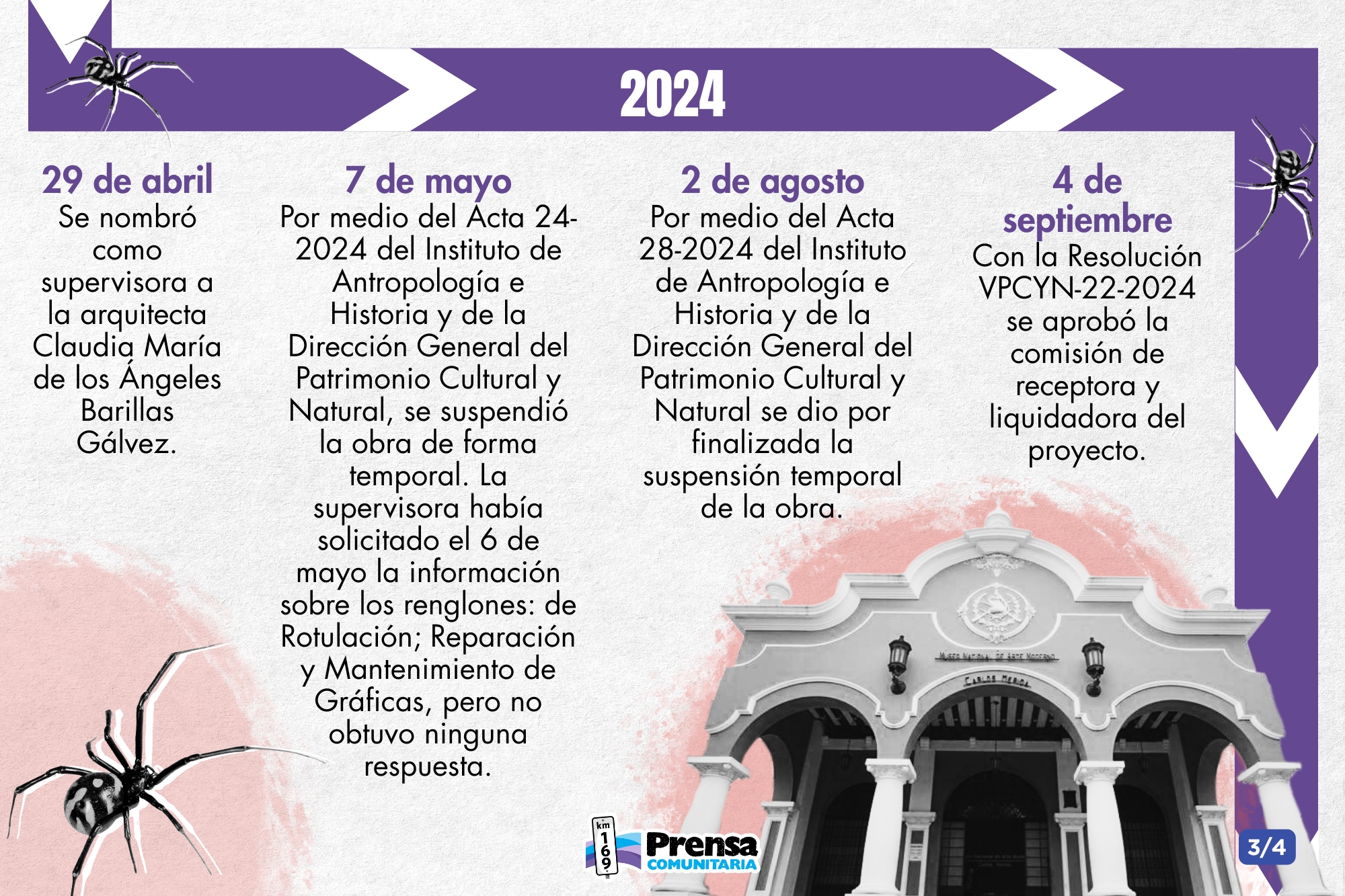 Se adjudicó la obra a ARCOS Proyecciones, S.A., el 12 de octubre de ese año, con un plazo de 212 días calendario (un aproximado de 8 meses) a partir del 25 de enero de 2023. Pero, la obra se suspendió del 7 de agosto al 7 de septiembrede ese año. Esta empresa fue la misma que hizo el cambio de cubierta del Museo de Arqueología y Etnología, por Q8 millones 700 mil.
