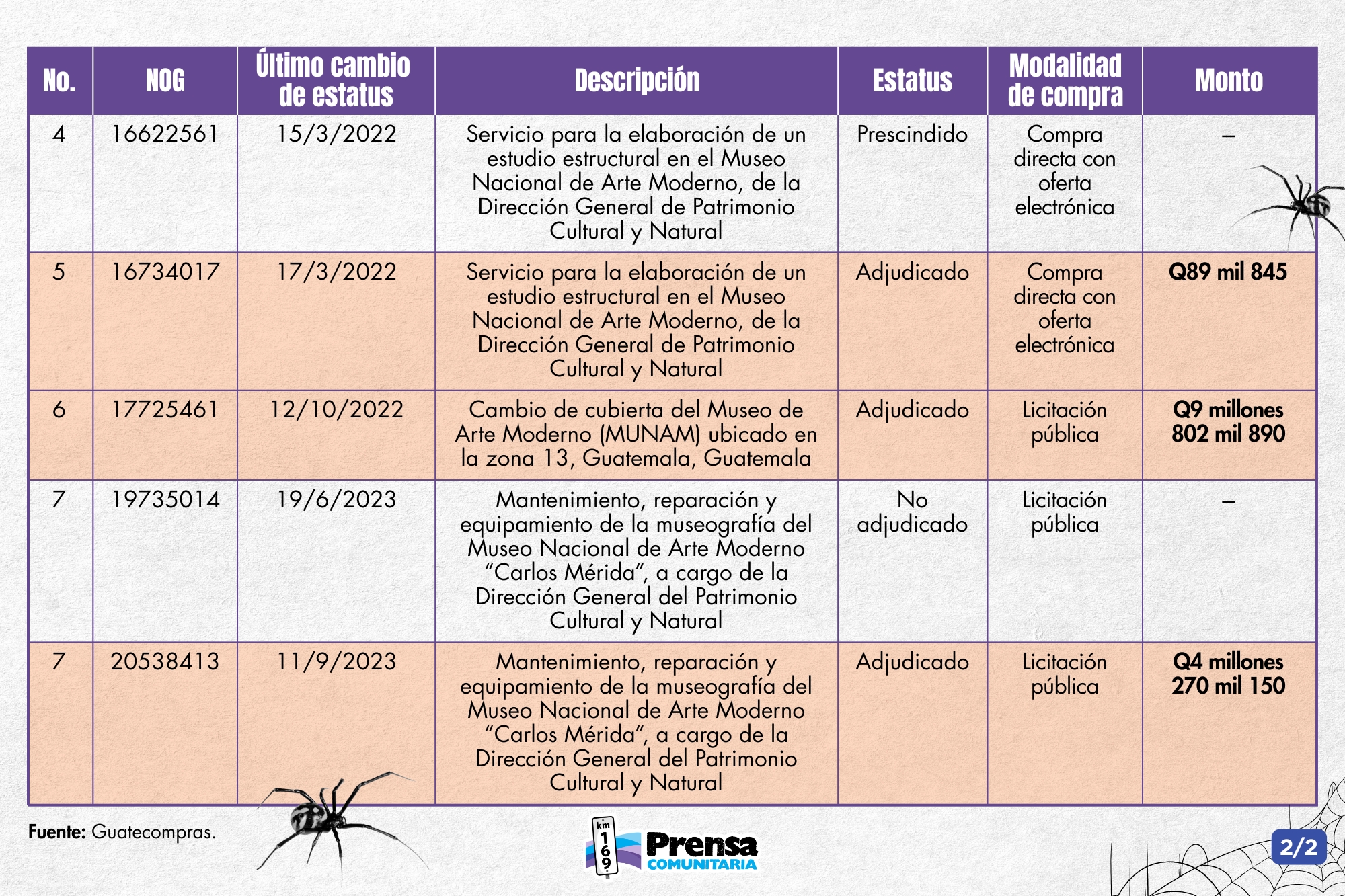 A finales de 2020, se publicó en el Sistema de Información de Compras y Adquisiciones del Estado (conocido como Guatecompras) un proceso de compra directa con oferta electrónica (NOG 13661485) con la finalidad de contratar un “servicio de mantenimiento e impermeabilización del techo y baldosa del edificio que ocupa el Museo Nacional de Arte Moderno “Carlos Mérida”.